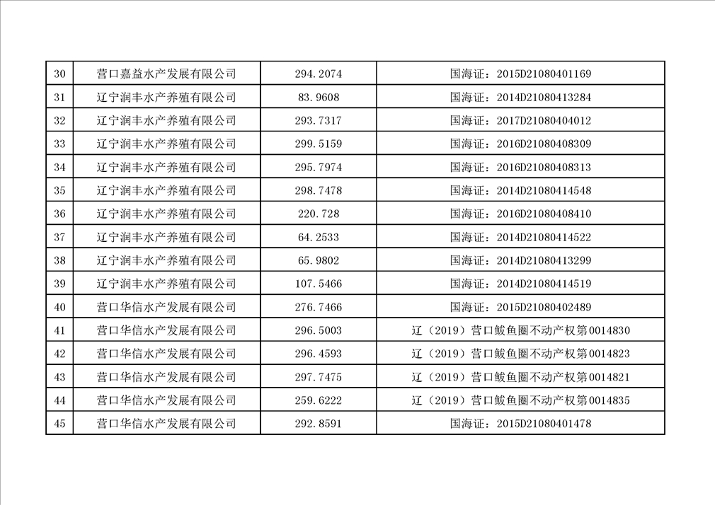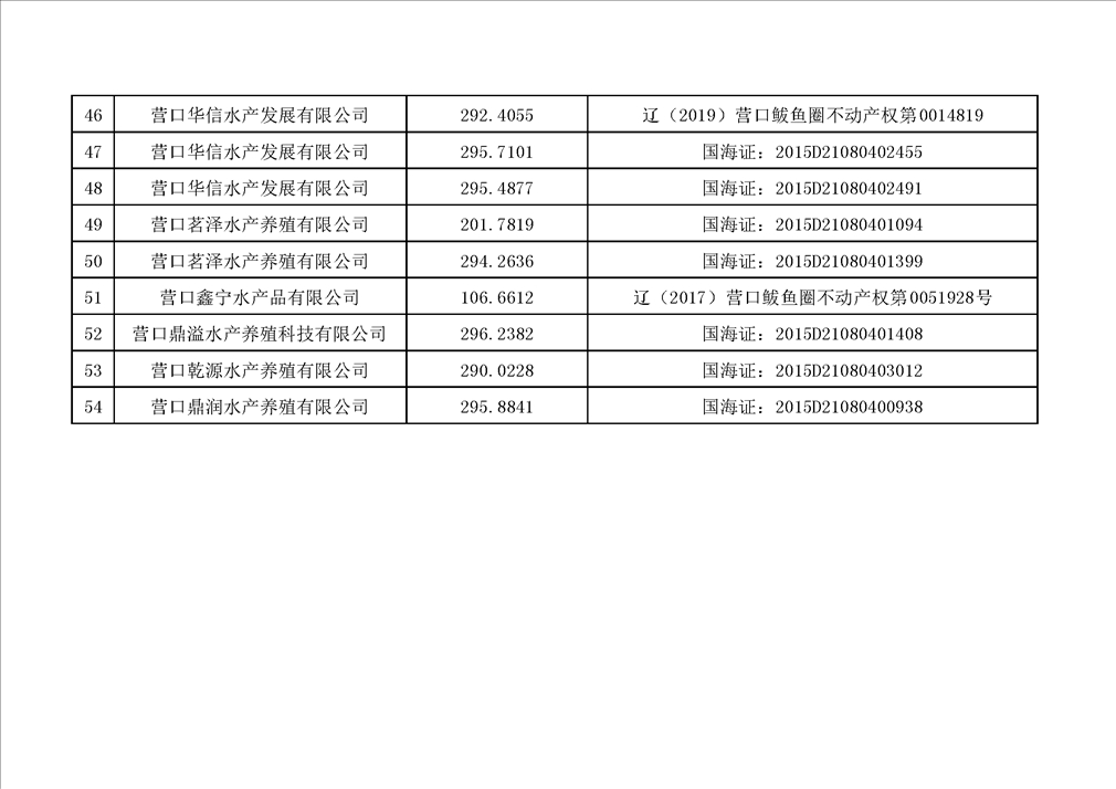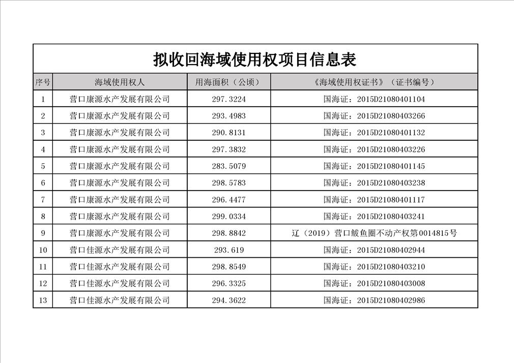 现有辽宁润丰水产养殖有限公司等11家企业54宗用海项目欠缴海域使用金,经多次催缴仍未缴纳,根据《中华人民共和国海域使用管理法》等法律法规,我单位拟报请鲅鱼圈区人民政府收回该54宗项目海域使用权,现予以公示。公示期10日,如对该决定有异议者,须在公示期间向营口市鲅鱼圈区海洋与渔业局提出并提交书面材料。公示期满无异议的,报请鲅鱼圈区人民政府依法收回项目海域使用权。