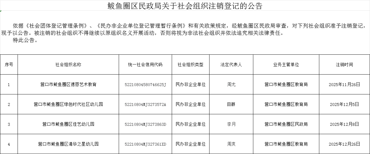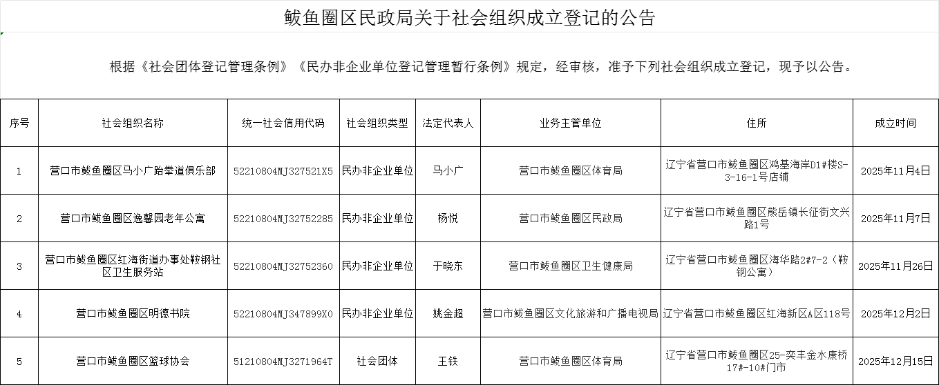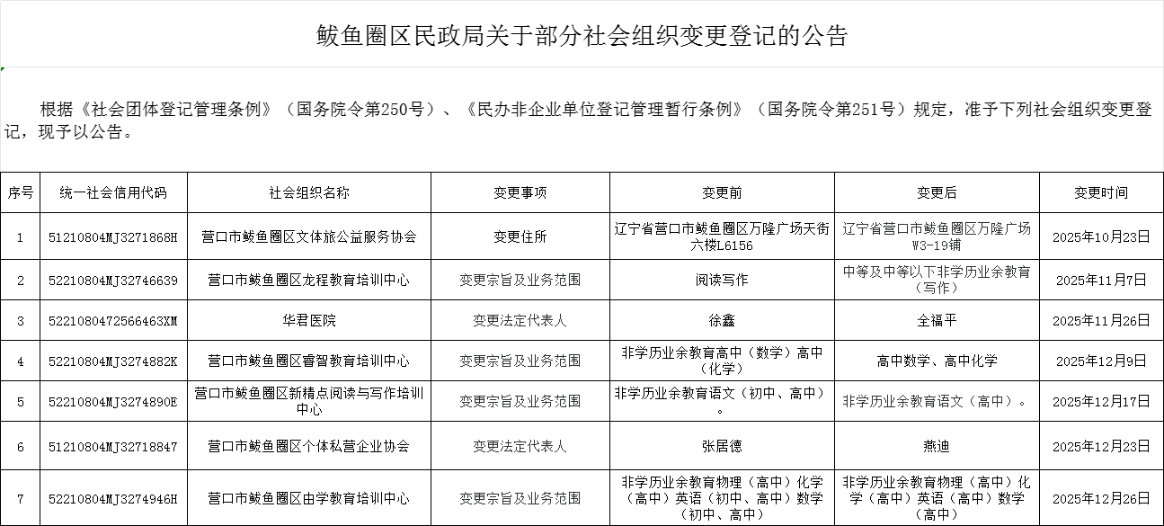 四季度鲅鱼圈区民政局关于社会组织成立、注销、变更公告