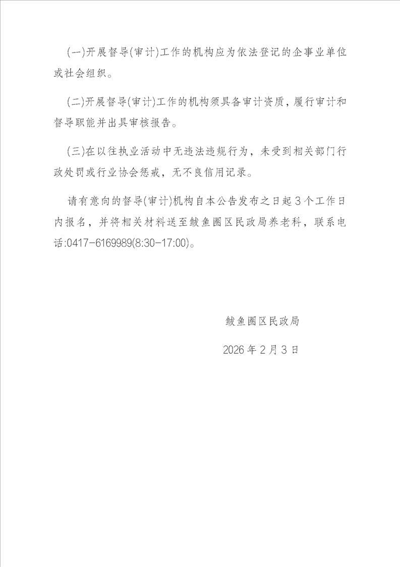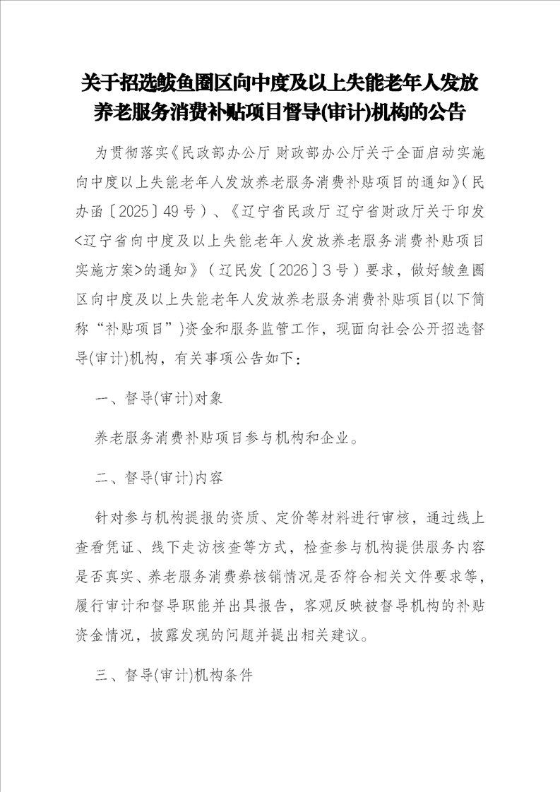 关于招选鲅鱼圈区向中度及以上失能老年人发放养老服务消费补贴项目督导(审计)机构的公告