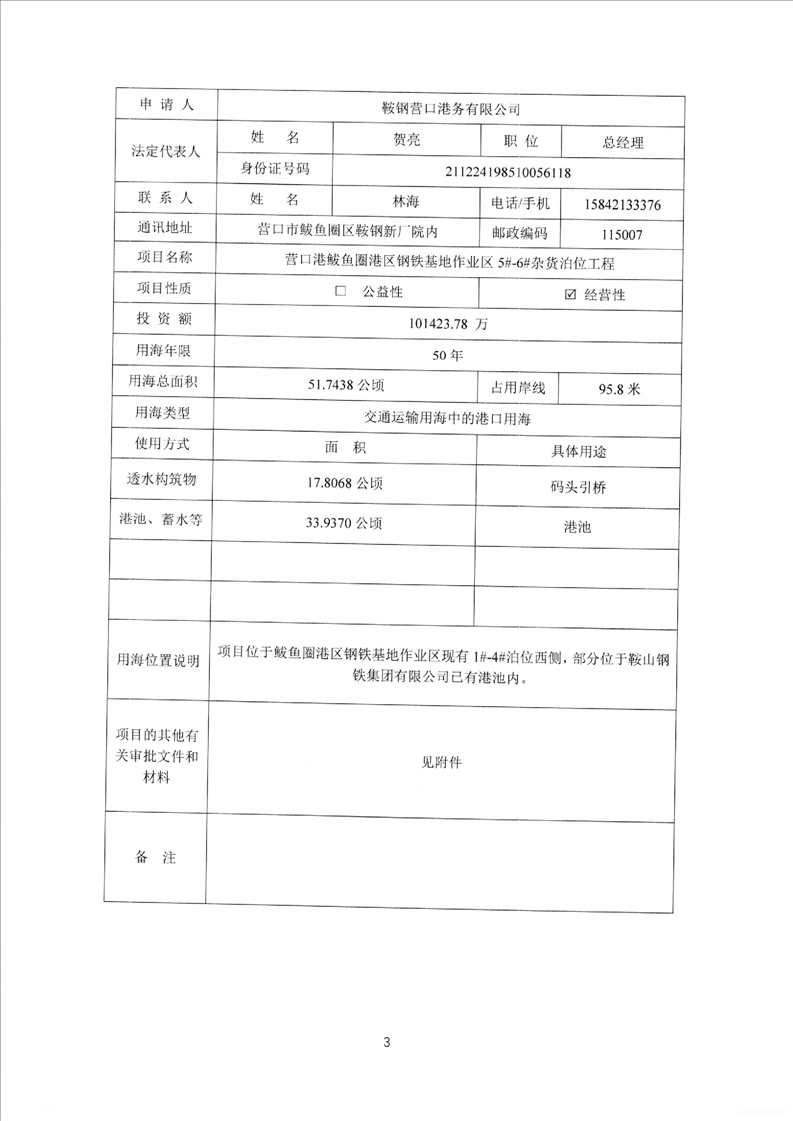 附件:海域使用申请书-营口港鲅鱼圈港区钢铁基地作业区5#-6#杂货泊位工程