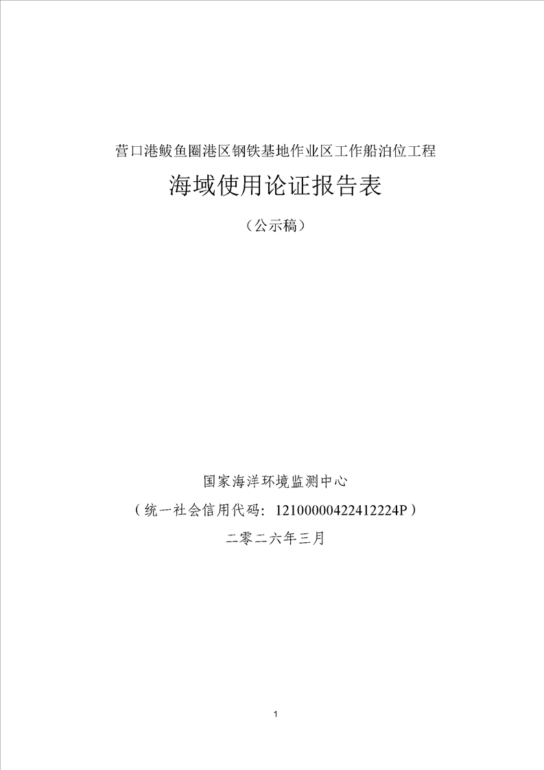 根据《自然资源部关于规范海域使用论证材料编制的通知》(自然资规〔2021〕1号)的要求,现将《营口港鲅鱼圈港区钢铁基地作业区工作船泊位工程海域使用论证报告书》(公示稿)的相关情况公示如下: