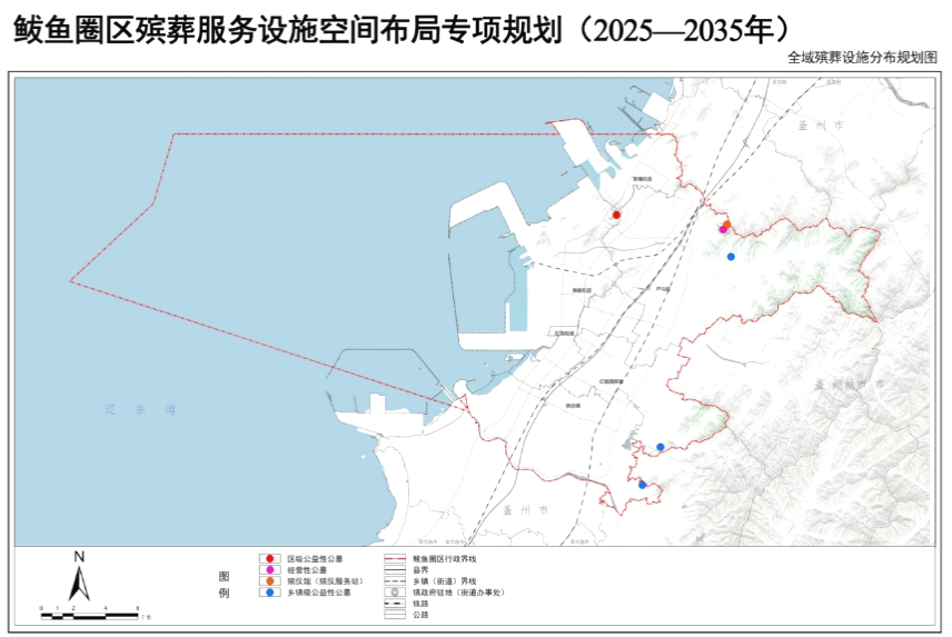 为保障鲅鱼圈区公益性殡葬服务事业发展,满足区域内居民殡葬服务设施需求,鲅鱼圈区规划近期新建1处鲅鱼圈区城市公益性公墓。