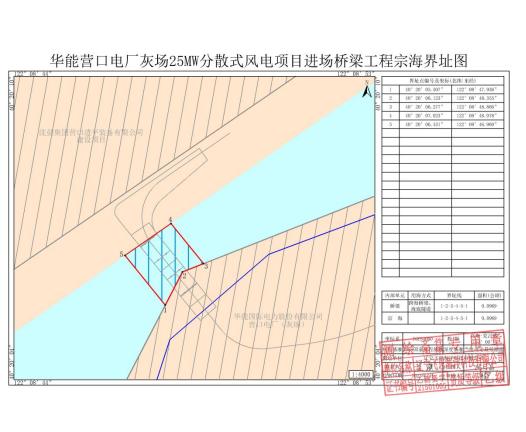 华能营口电厂灰场25MW分散式风电项目进场桥梁用海项目位于辽东湾东岸鲅鱼圈区小董屯,华能营口发电厂贮灰场西北侧海域,营口北方热电有限公司大门南侧,河道最窄位置,用海面积为0.0969公顷,用海类型为交通运输用海,用海方式为透水构筑物,申请用海期限25年。