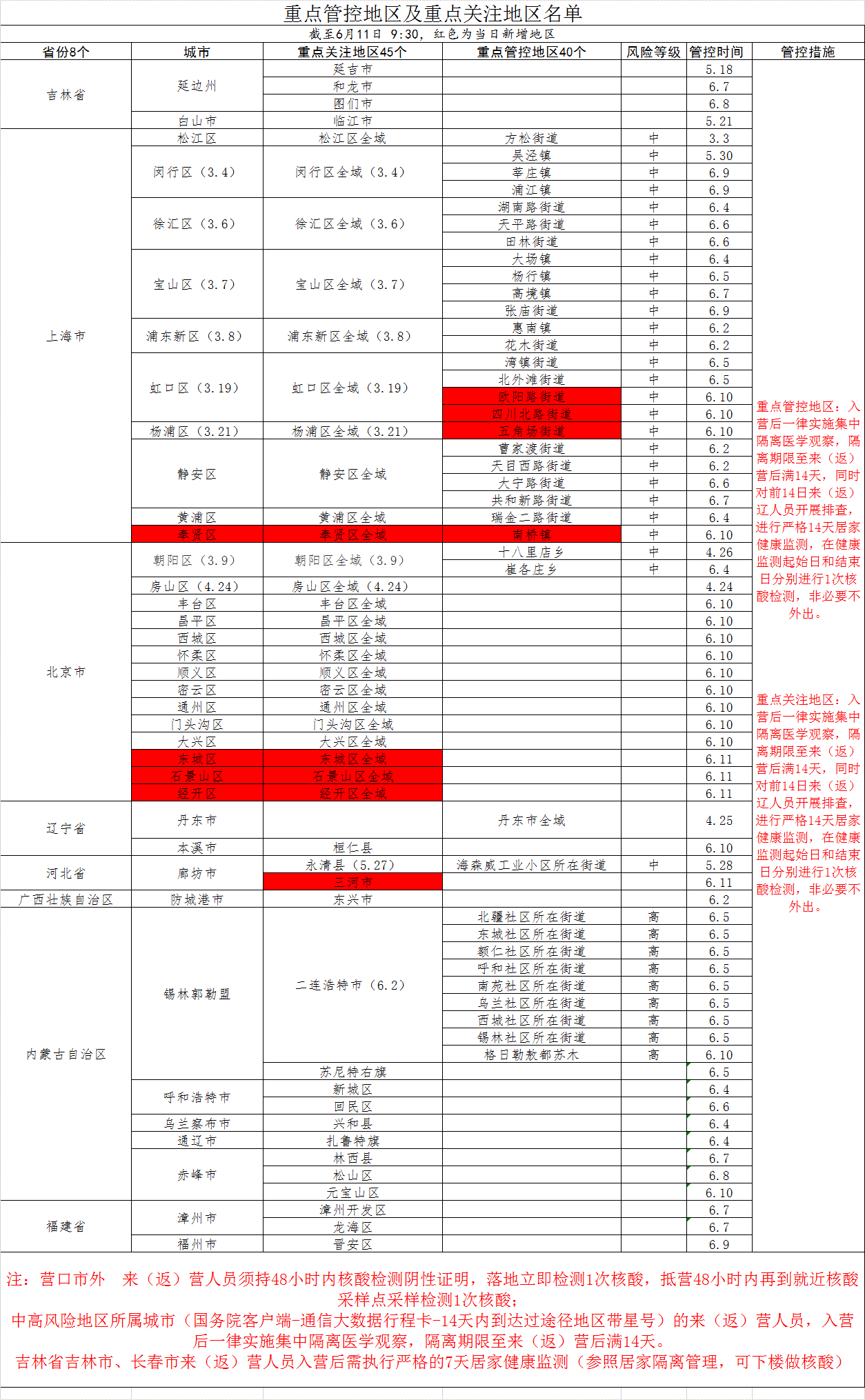 重点管控地区及重点关注地区名单(截至6月11日9:30)